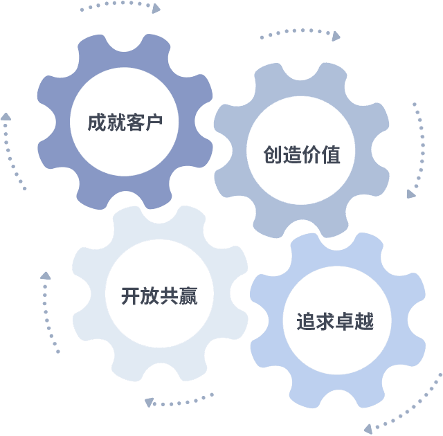 成就客户是一切决策的出发点,,,,创造价值是衡量所有工作的标准,,追求卓越是我们做事做人的态度,,开放共赢是我们的格局也是最终的结果。。。价值观的齿轮环环相扣,,,推动着组织里的每个人不断向前。。。